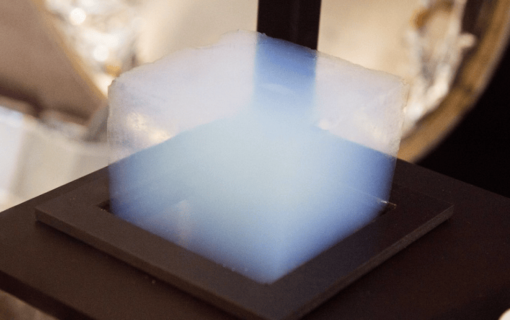 气凝胶或“蓝烟”由 Samuel S. Kistler 在 1930 年代发明,是人类已知的密度最小的固体,并且是一种绝缘体,其效率是玻璃纤维和泡沫的四倍。它由90%空气组成。由于其半透明的特性,它被称为“冷冻烟雾”、“蓝色烟雾”和“固体烟雾”。
